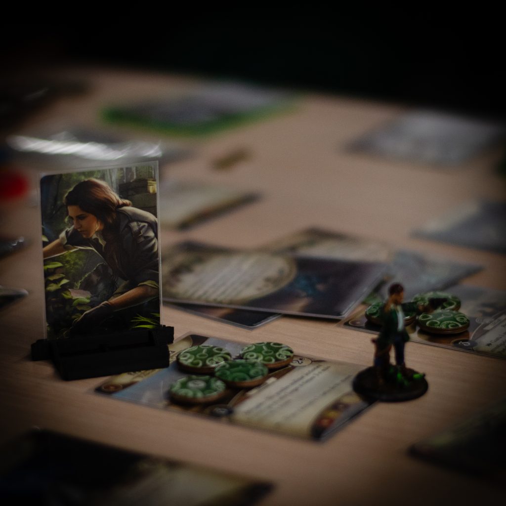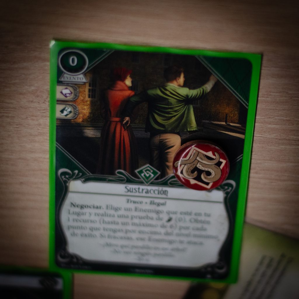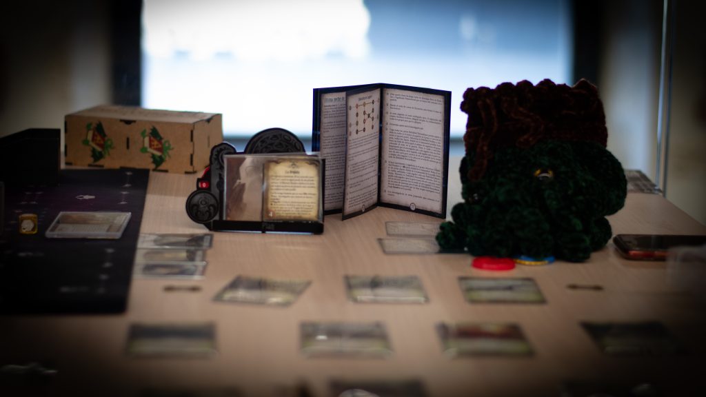 Pequeña explicación por parte de Organización, ¡y al turrón! Empiezan a caer cartas al tapete, primeras pistas, primera ficha roja…sale un enemigo, sale la ficha roja…Perdemos cordura en un solo turno como si no hubiera un mañana (lo cual es apropiado en este caso), sale la ficha roja…nos movemos por el mapa, investigamos…sale la ficha roja, se revela quién es el sucio sectario que está tramando en la sombra, le sale a él la ficha roja…se desvela el caos, que viene con toda su cohorte de esbirros, empiezan los combates serios, sale la ficha roja…Por si no os habíais dado cuenta hasta ahora, hay un patrón muy sutil en la partida.